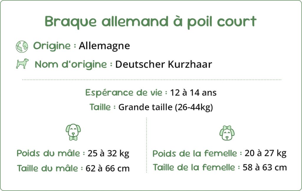 Le Braque allemand à poil court est un chien de grande taille, musclé, à l’allure noble et élégante.