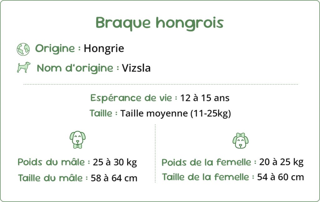 Le Vizsla est un chien de taille moyenne, à la construction harmonieuse et musclée, dégageant une impression de noblesse et d’élégance .