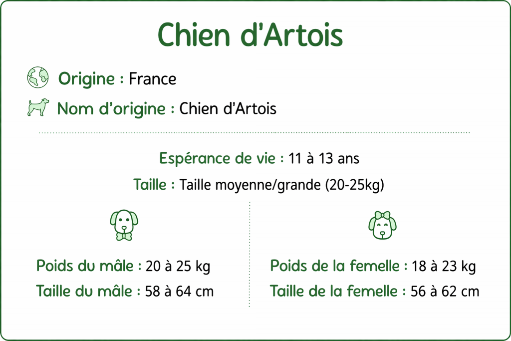 Le Chien d’Artois est un chien courant de taille moyenne, robuste et bien proportionné. Sa silhouette harmonieuse dégage une impression de force et d’élégance rustique.