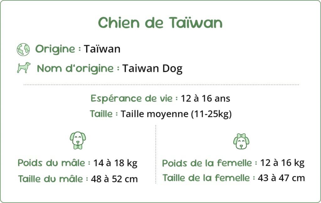Le Chien de Taïwan est un chien de taille moyenne, à la silhouette sèche, tout en muscles et bien proportionnée. Il dégage une impression de puissance et d’agilité, avec une forme presque carrée.