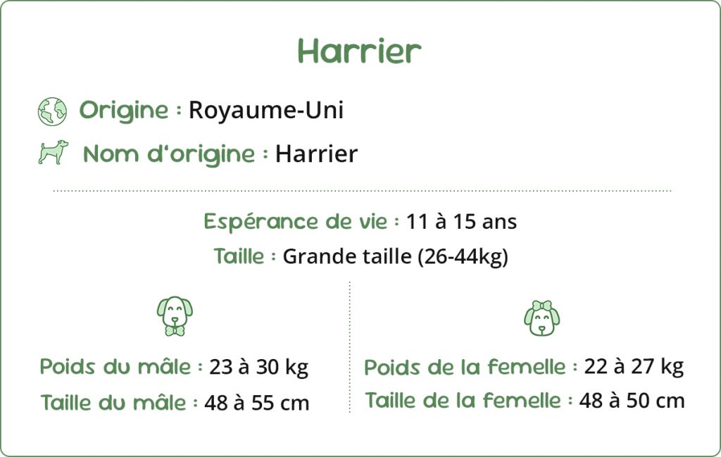 Le Harrier est une race britannique de souche très ancienne, dont l’histoire remonte à plusieurs siècles. Son nom proviendrait très probablement du mot anglais “hare”, qui signifie lièvre, sa proie de prédilection.