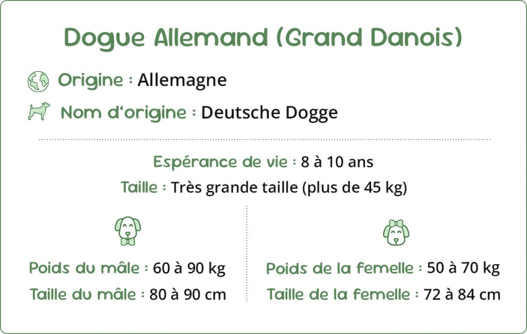 Initialement utilisé pour la chasse au gros gibier (sangliers, ours), il devint par la suite le gardien des domaines seigneuriaux et des cours royales. Sa noblesse naturelle et son port altier en firent un symbole de prestige. Le nom « Dogue Allemand » (Deutsche Dogge) fut officiellement adopté en 1878, tandis que l’appellation « Grand Danois » reste courante en France, bien qu’historiquement inexacte.