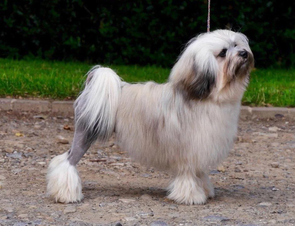 - Queue : Attachée dans le prolongement de la croupe, portée gaiement en arc de cercle au-dessus du dos, sans toucher l’échine. Elle est tondue à l’exception d’un pompon à son extrémité.
