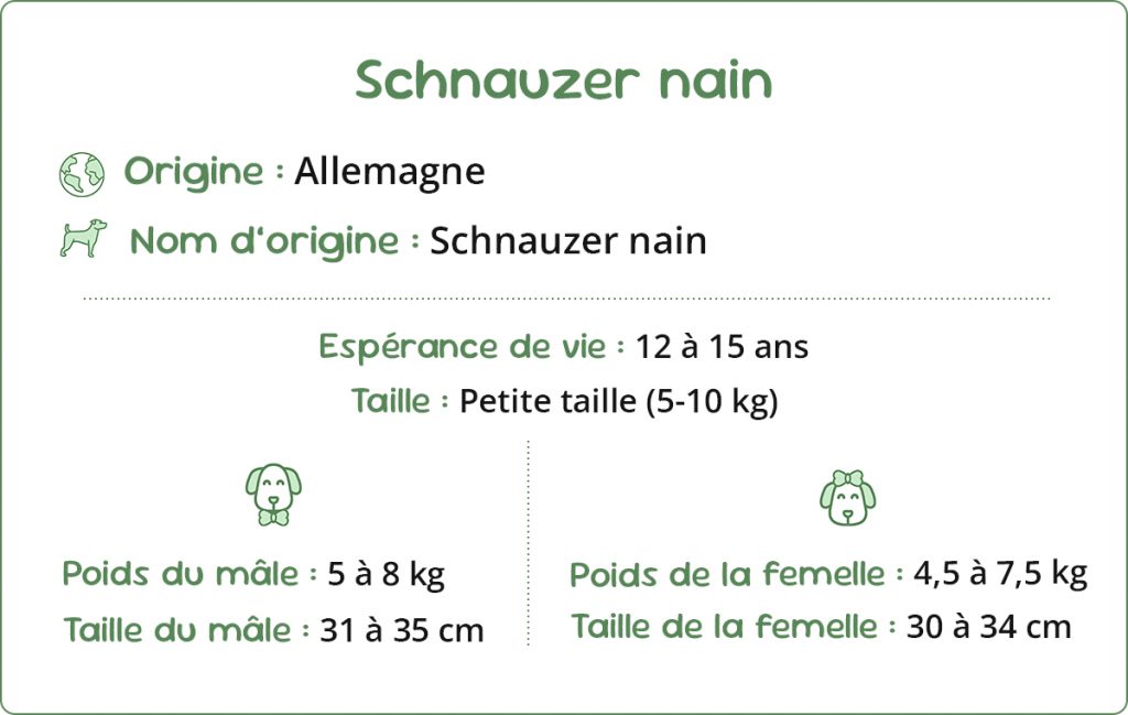 Le Schnauzer Nain est le plus jeune des trois Schnauzers (Géant, Moyen, Nain). Il a été créé en Allemagne à la fin du 19ᵉ siècle par des croisements entre le Schnauzer Moyen (son ancêtre direct) et des races plus petites comme l’Affenpinscher et peut-être le Caniche ou le Spitz nain.