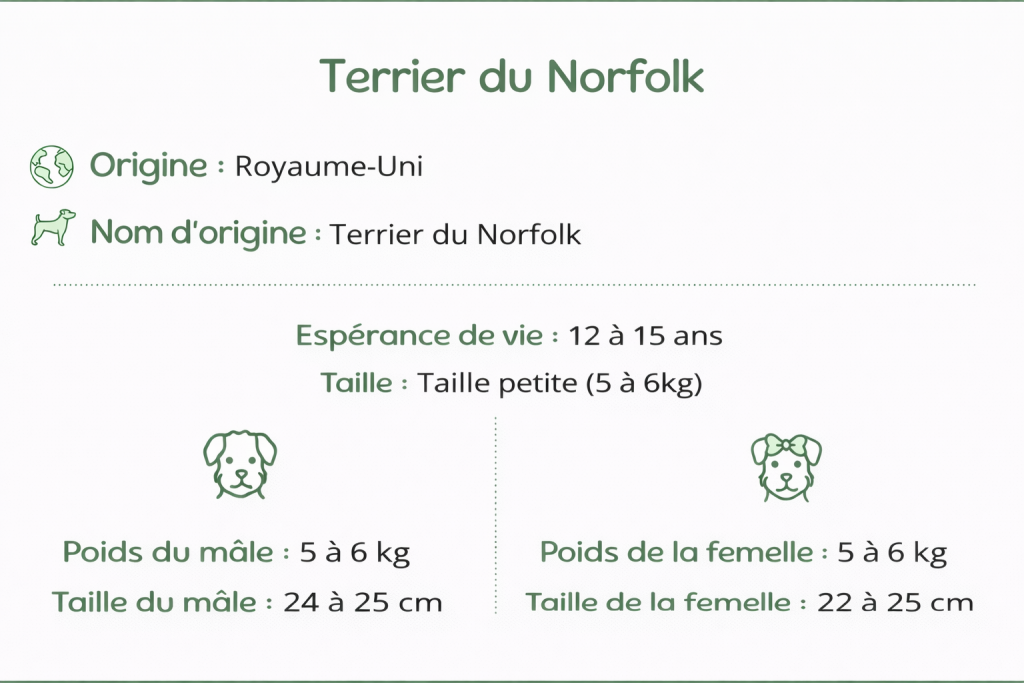 Le Terrier du Norfolk, souvent confondu avec son proche cousin le Norwich Terrier, est un petit chien au caractère bien trempé et à l’allure rustique. Avec sa silhouette compacte, son poil dur et ses oreilles tombantes, il séduit par son authenticité et sa bonne humeur communicative. Derrière ces airs de chien campagnard se cache un compagnon vif, courageux et profondément attaché à sa famille. Ce guide complet vous présente cette race attachante, aussi à l’aise au jardin que dans un salon.