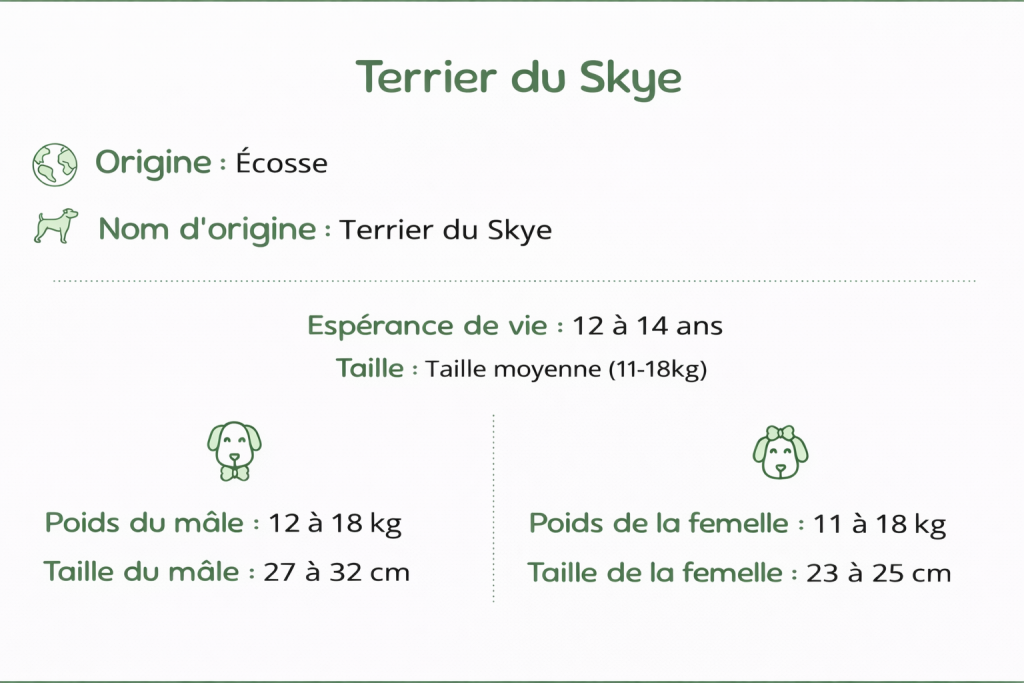 Le Skye Terrier est un petit chien à la silhouette allongée et au poil somptueux, originaire des brumeuses îles écossaises. Avec son air sérieux, ses oreilles dressées ou tombantes et sa robe abondante, il ne passe jamais inaperçu. Derrière cette apparence de chien aristocratique se cache pourtant un terrier authentique : courageux, loyal, parfois têtu, mais profondément attaché à sa famille. Ce guide complet vous présente cette race rare et attachante, véritable trésor du patrimoine écossais.
