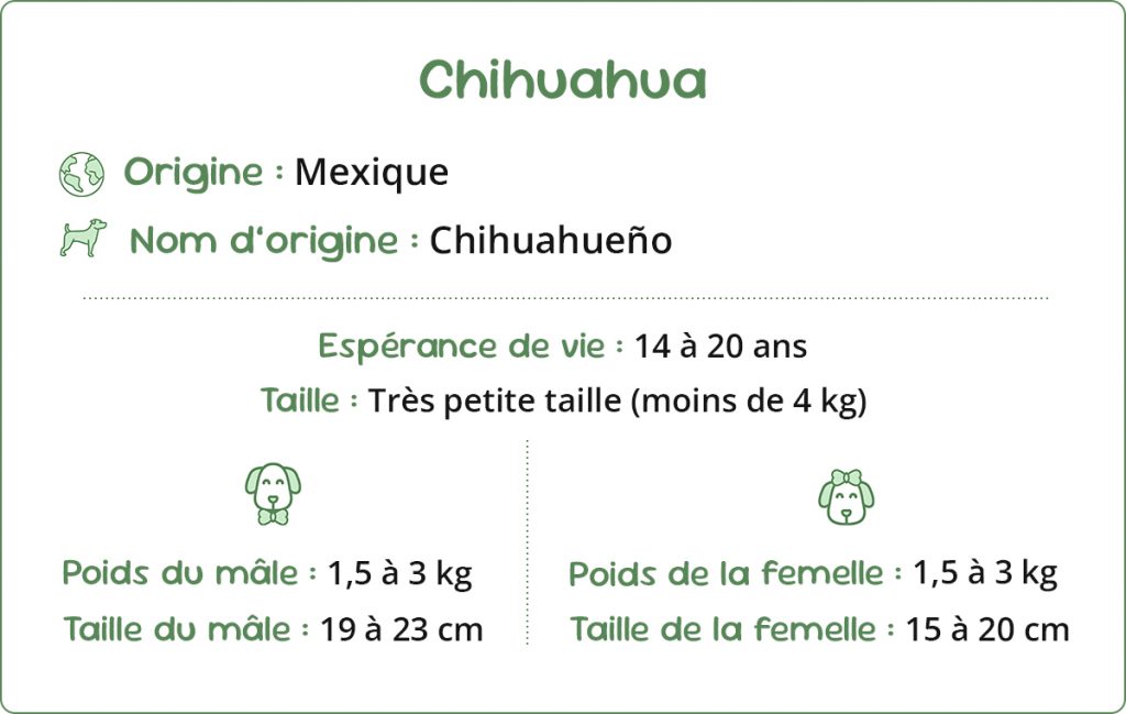 - Taille et Poids : C’est la race de chien la plus petite au monde. Le standard met l’accent sur le poids et non la taille. Le poids idéal se situe entre 1,5 et 3 kg. Les chiens de moins de 500 g ou de plus de 3 kg sont hors standard. Sa silhouette est compacte et équilibrée.